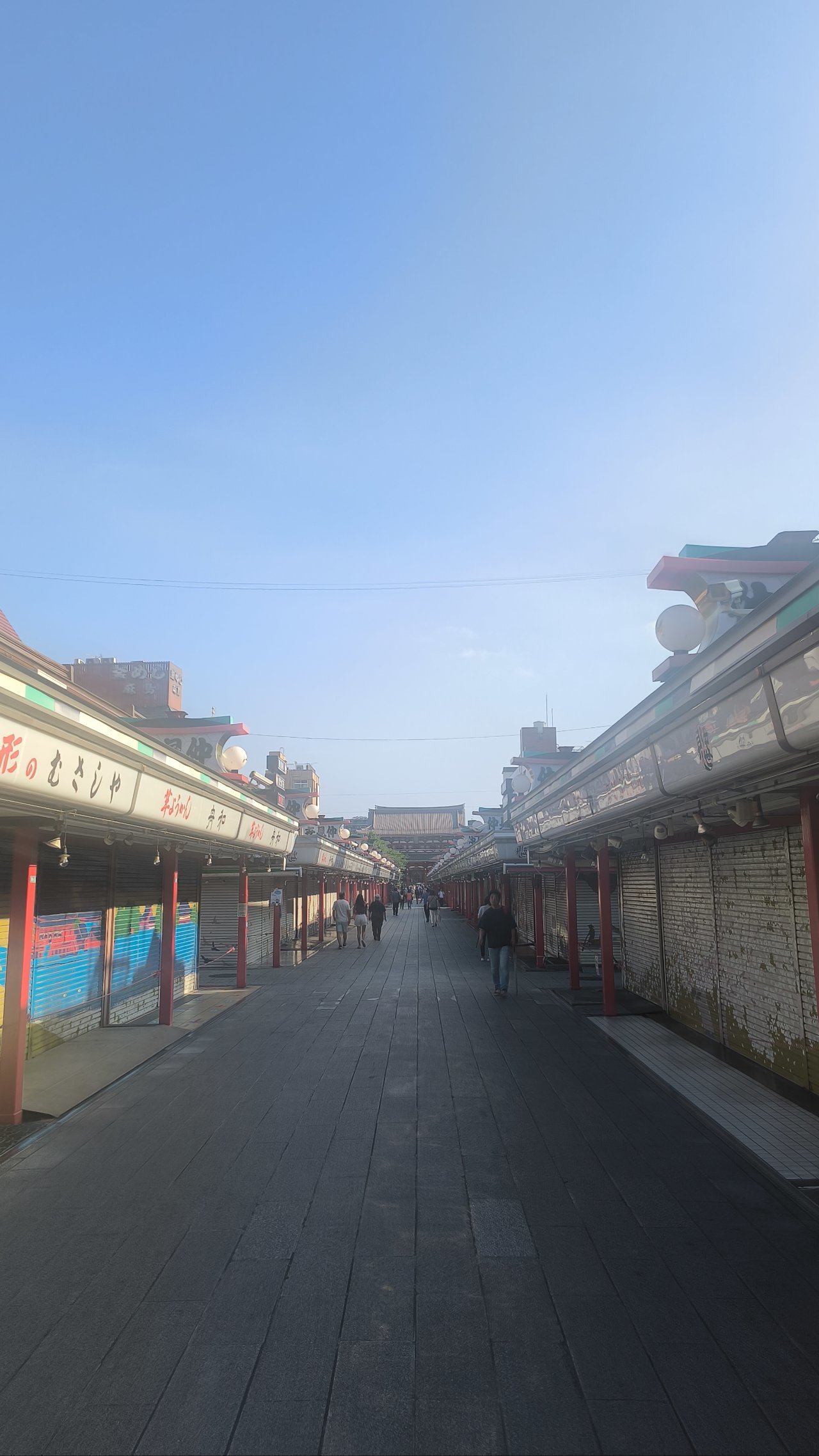 明明还是清晨,空气中已经隐隐约约感受到一丝热意了,雷门离主殿中间还有一截商店街,卷帘门上有不少当地特色画,早上人不多,可以肆意走在正中央。