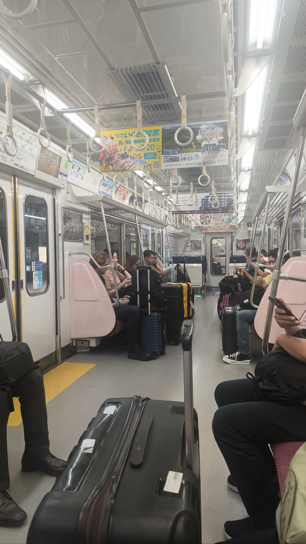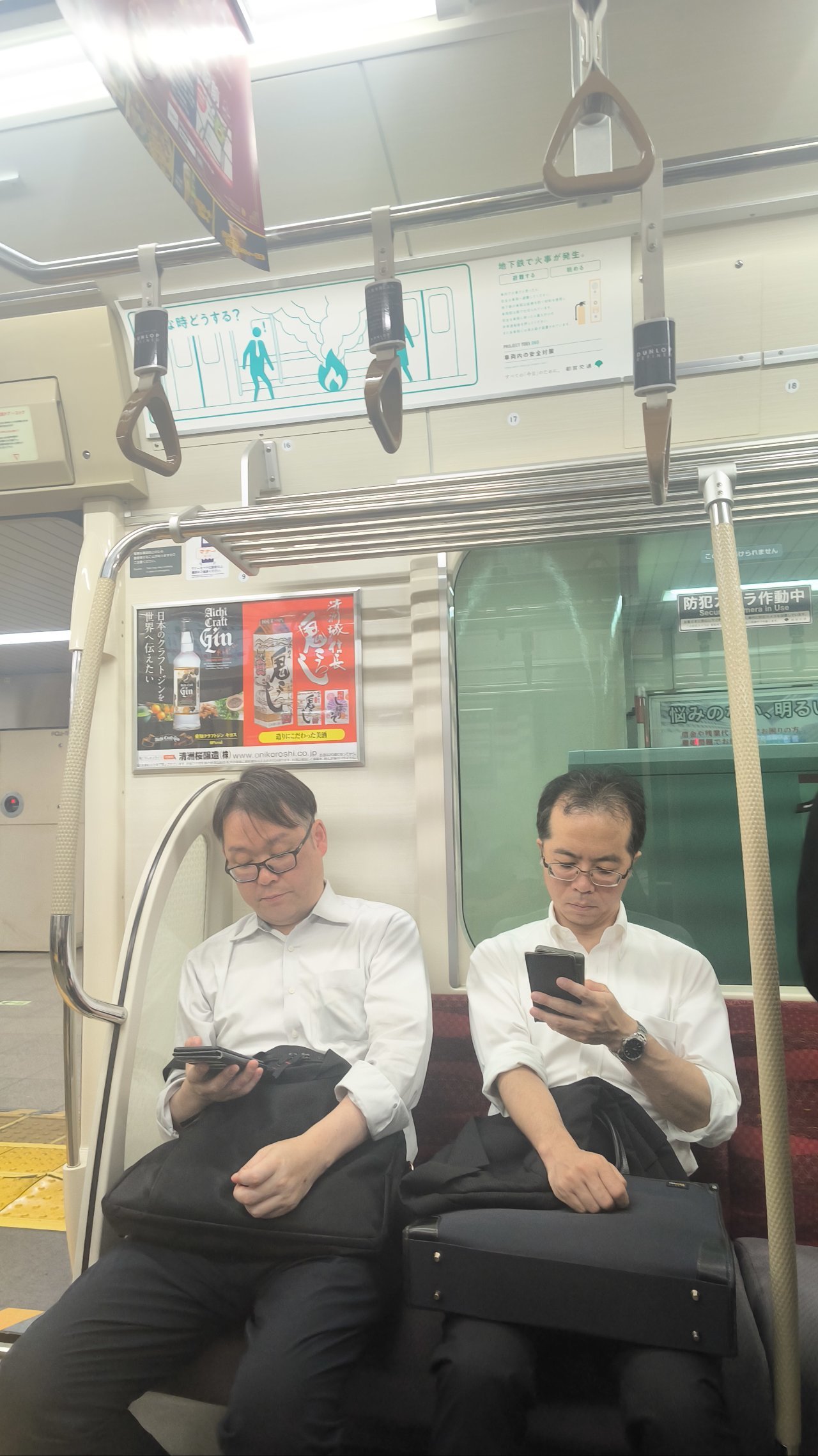 日本的地铁感觉略微有点摇摇晃晃,空气中有清新剂的甜味,椅子是软包的,靠背已经有点显黑了。过了几站后日本的通勤族开始多了起来了,感觉年轻人很少,大叔很多,许多人都眯着眼在睡觉。