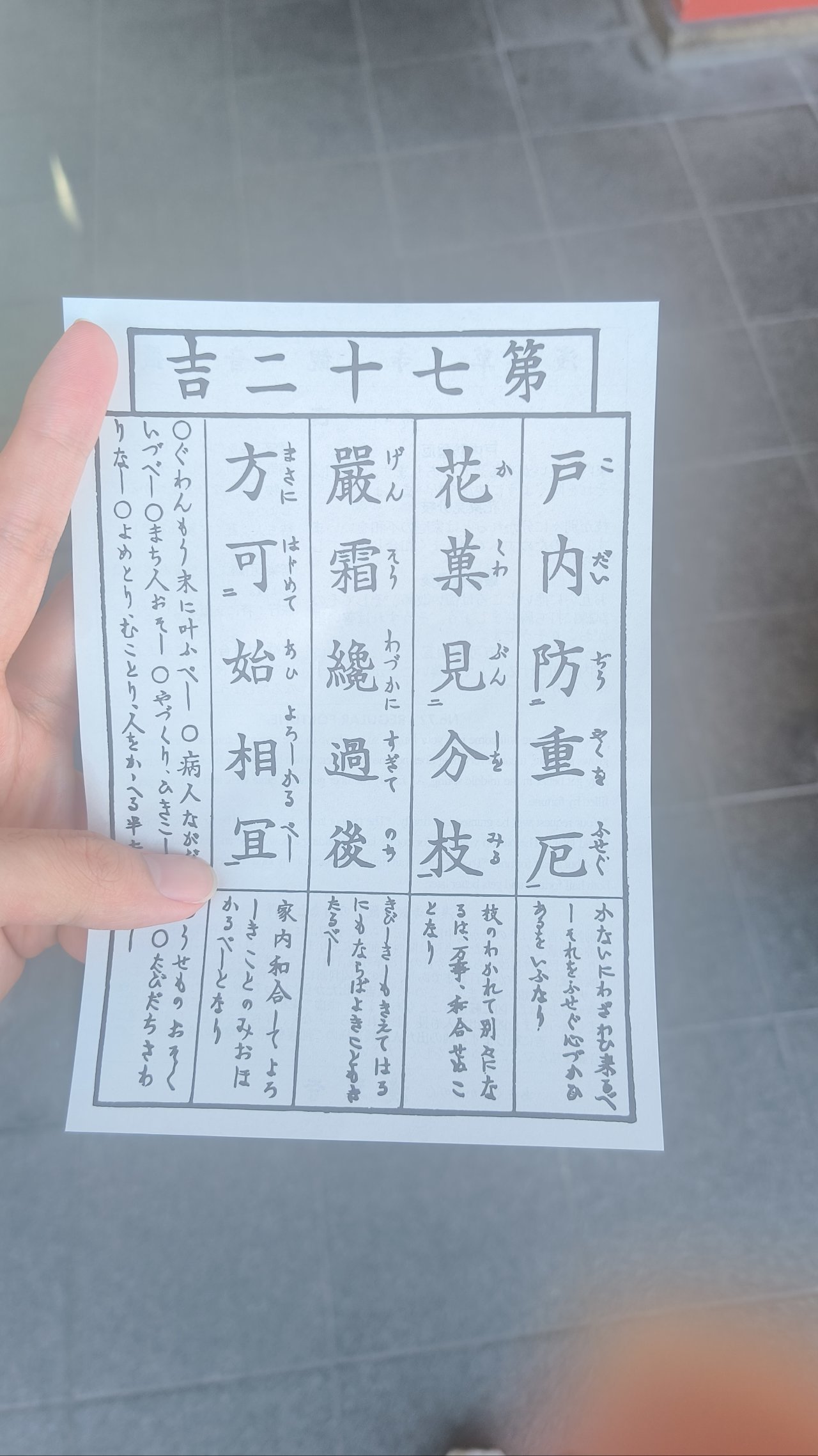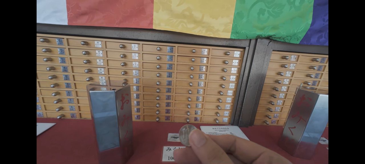 简单来说就是投币,摇签,看签号去拿对应柜子里的签纸,抽到凶可以绑在附近的架子上。