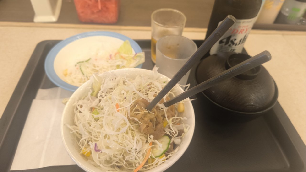 中午在松屋吃的牛肉饭与冰镇啤酒,饭很一般,啤酒也一般,喝这老是有种消毒水的感觉,甚至有点难喝,不过冰镇的真的很爽。这边是自助买票的并且能用微信支付,你把票买好给他就行,记得一个菜品一张票,我就把啤酒的票忘在售票机里了。 吃完把餐具放回回收处就行。