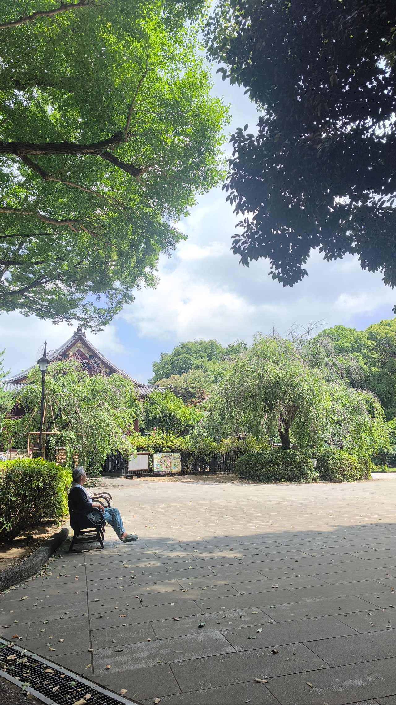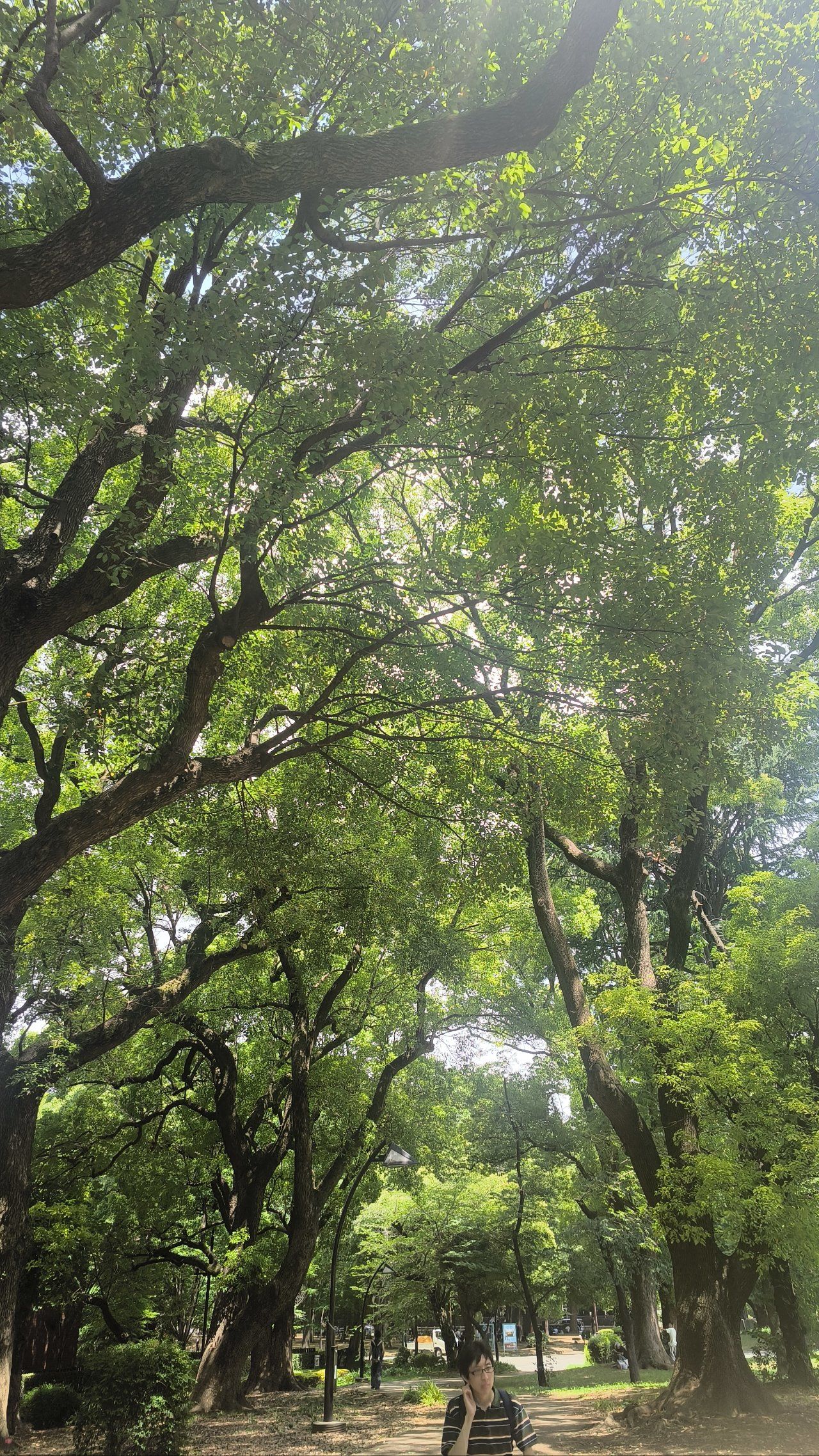从地铁口出来走了一小段台阶,进入了上野公园,初看和国内普通公园没有什么区别,入口处有几个长椅被流浪汉占据了,我看还有空椅子便坐在这里歇了一会儿,树荫下的东京,少了几分燥热,高大的树木让空气并不沉闷,树梢间又有几阵凉风吹过,让人不由的大呼过瘾。