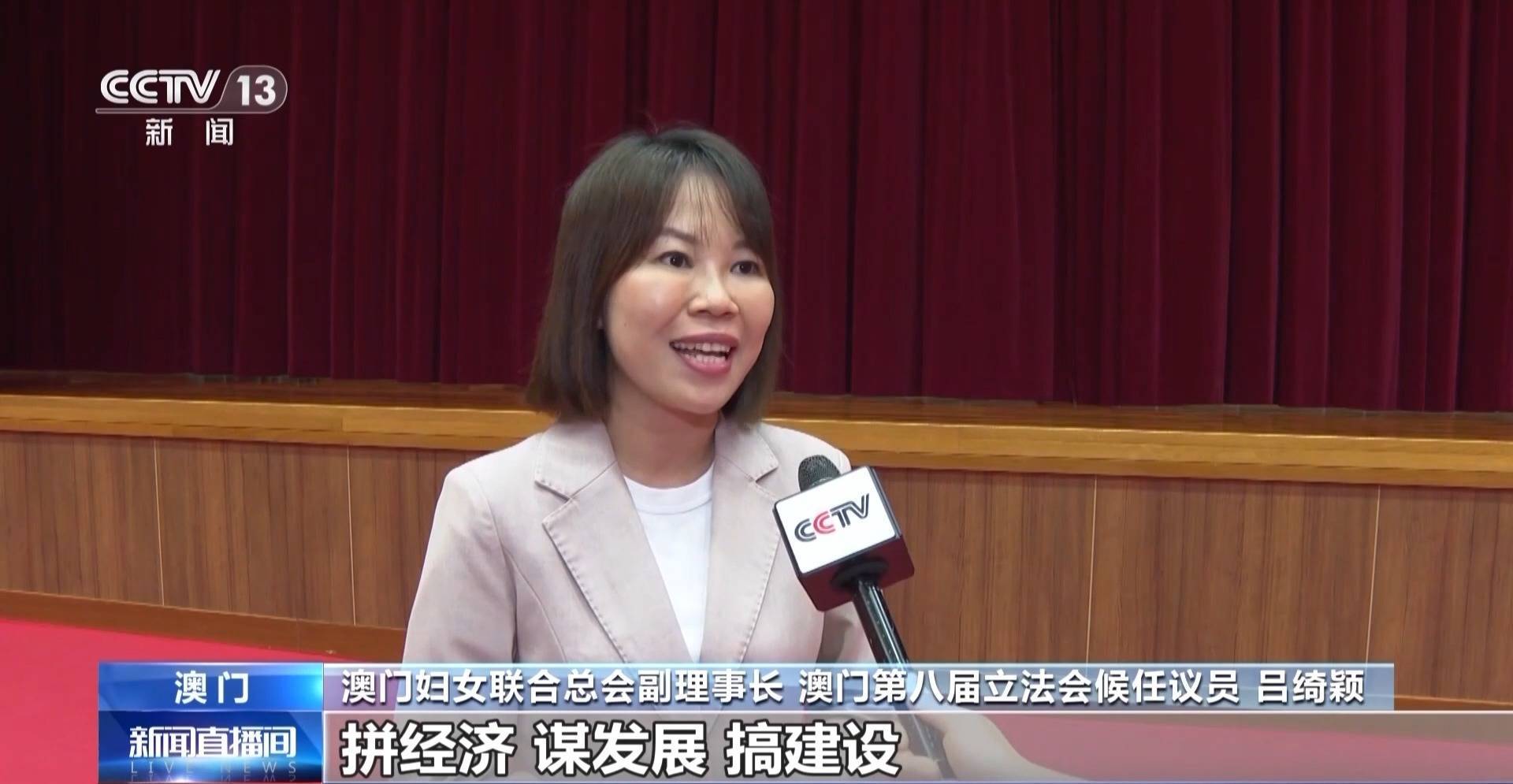 澳门妇女联合总会副理事长 澳门第八届立法会候任议员 吕绮颖:作为澳门青年,我非常荣幸进入了新一届的澳门立法会,未来我将会和我的团队一起凝心聚力,特别是要积极履职尽责,带领广大澳门居民一起集中精力,拼经济、谋发展、搞建设,为民族复兴以及强国建设作出澳门青年应有的贡献。